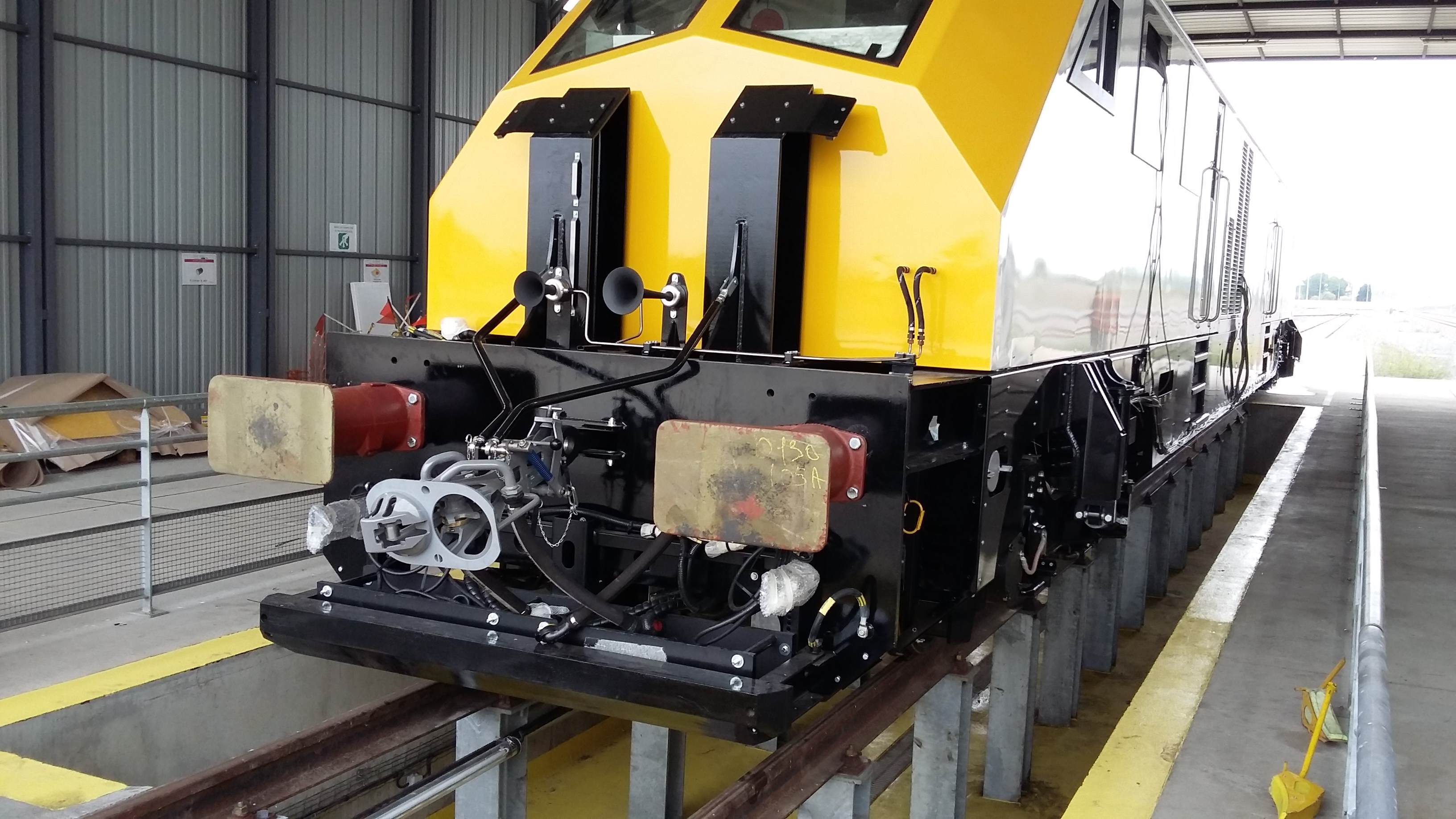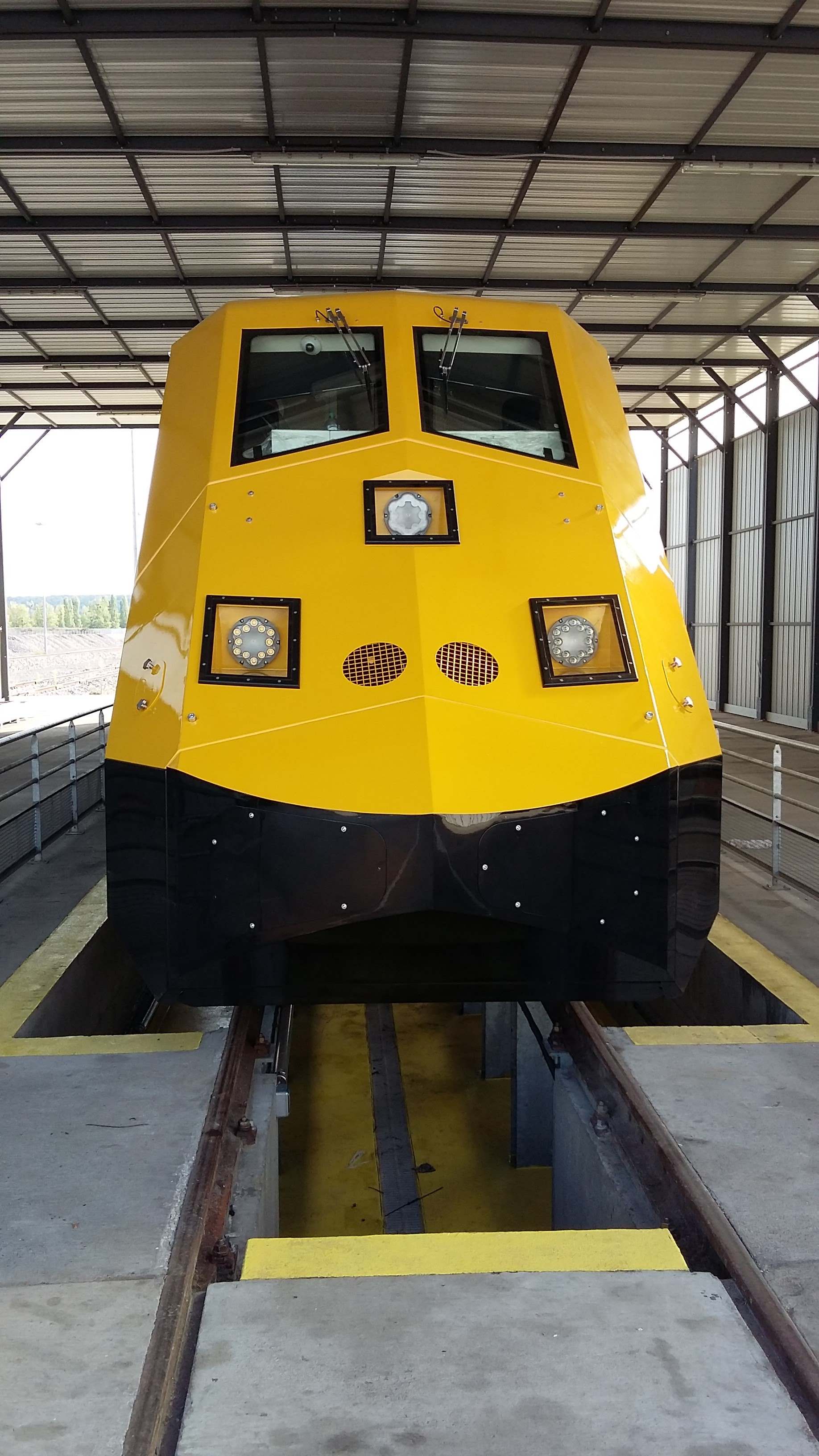 Pour finir voici la draisine BROOM préparée pour les essais: le nez est démonté, des tampons provisoires sont montés et la machine pourra être mise en véhicule avec l'attelage UIC standard lorsque l'attelage "de secours" Scharffenberg installé à demeure sous le carénage sera démonté.