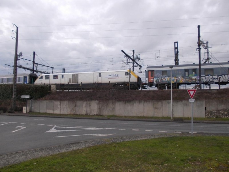 Draisine vu lundi à Sant-Pierre-des-Corps, tractée par la belle CC 72049 et derrière une Corail de l'AEF et en queue 3 fourgons.