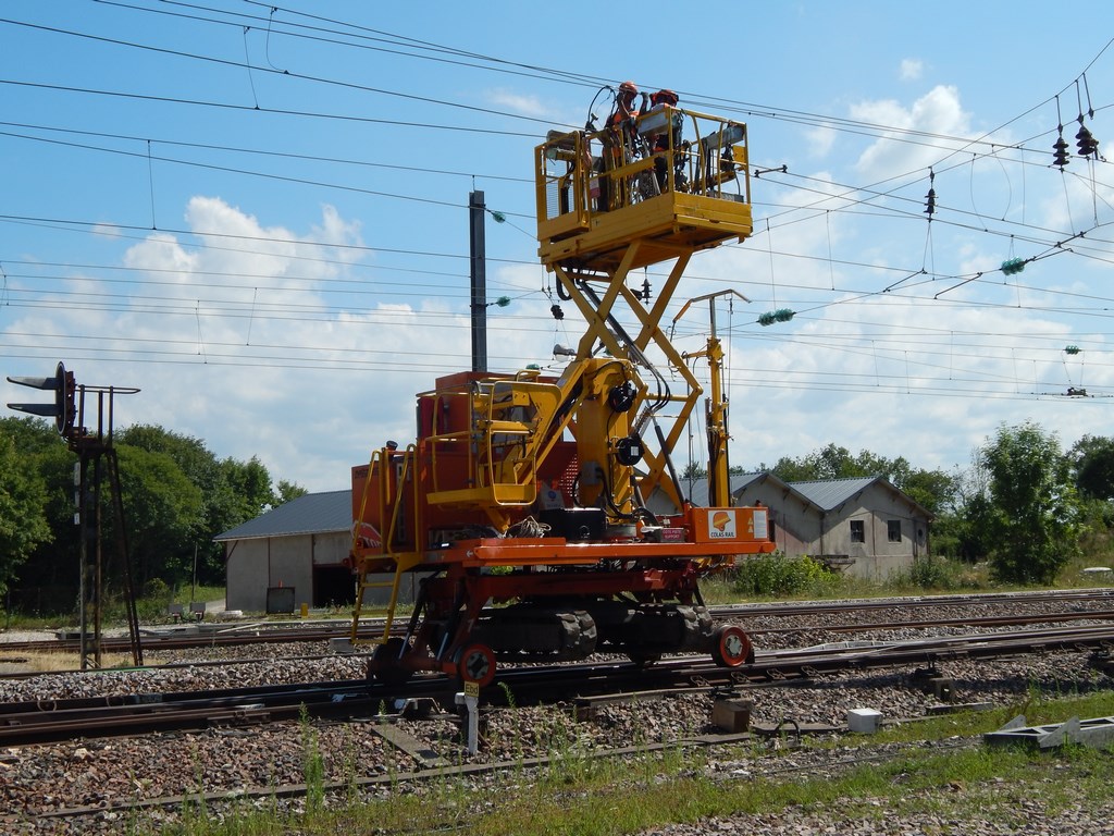 le 18/7/2018 Colas rail intervient sur la caténaire en gare d'Andelot en montagne (39)