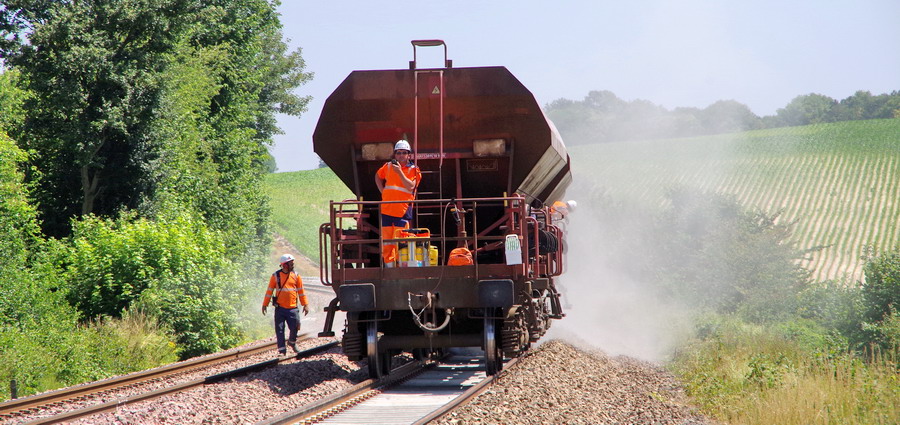 la rame de ballastage avec des wagons trémies D12 pour les LRS refoule en direction de la fin de 'La Coupe" à Blangy-Tronville le 27-06-2018