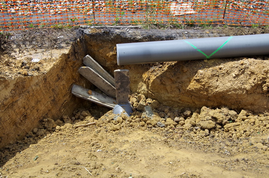 installation de tuyaux en PVC pour bassin de récupération des eaux de pluie par Colas Rail