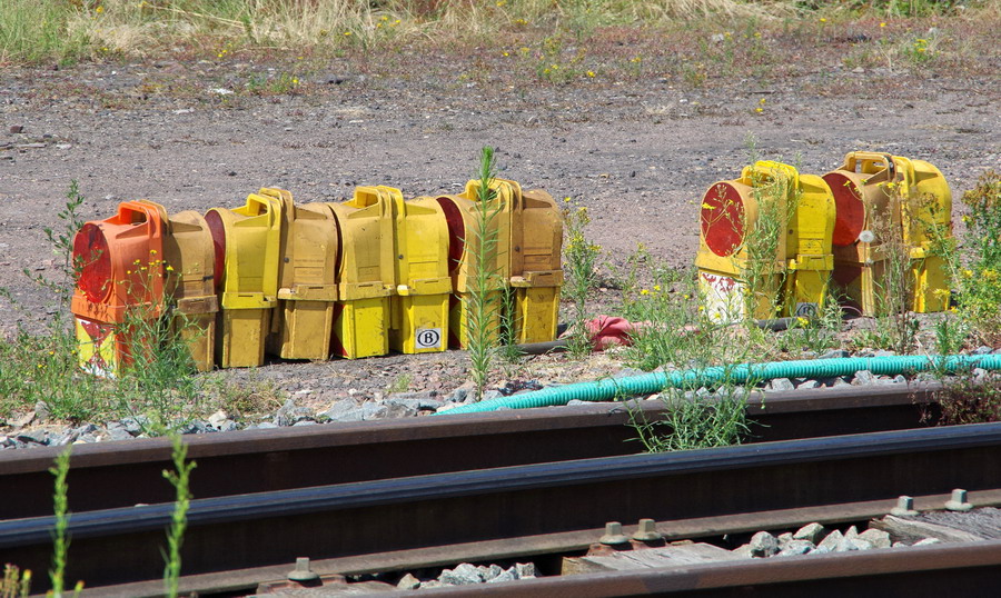 les lanternes de fin de convoi de rames de TTX sur la base de travaux de la gare de Laon le 19-07-2018