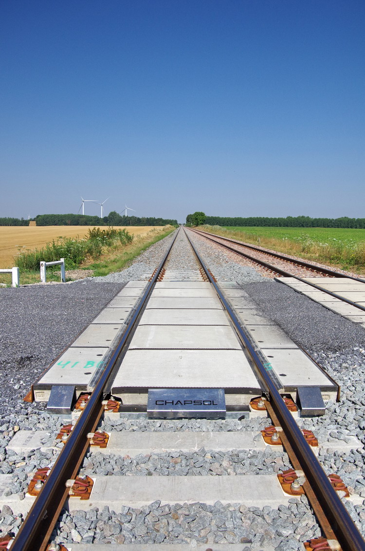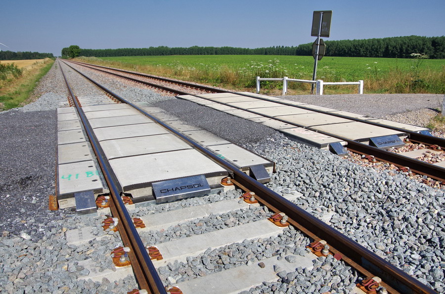 Cette solution a été retenue par la SNCF pour plusieurs réalisations sur le réseau ferré. Les raisons de ce choix ont reposé sur la rapidité de pose des dalles préfabriquées en béton afin de pénaliser le moins possible la circulation routière. La solution à attaches classiques permet de faciliter les interventions de dépannage et d'entretien par rapport à d'autres systèmes de maintien du rail.