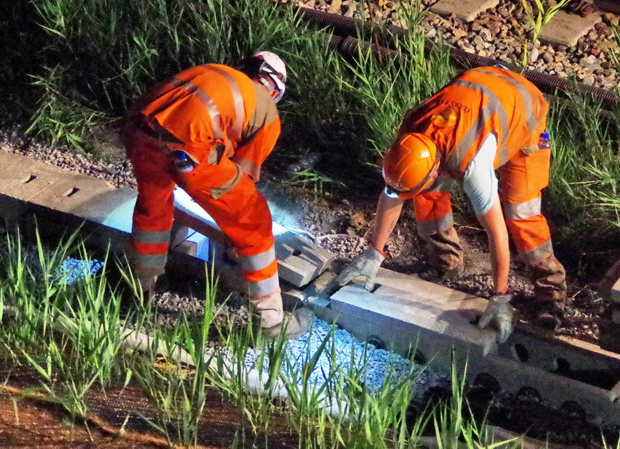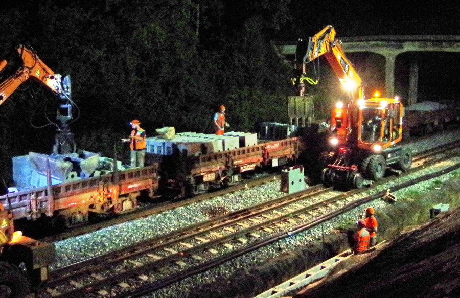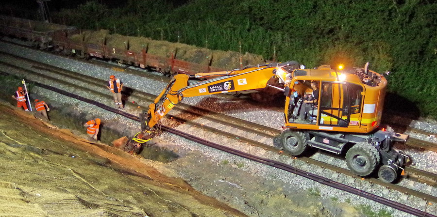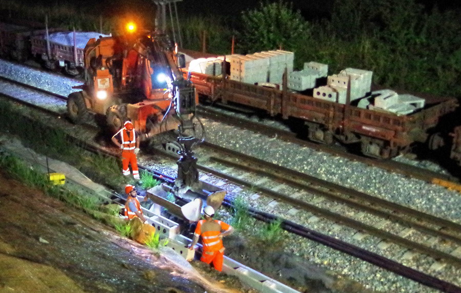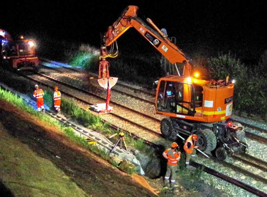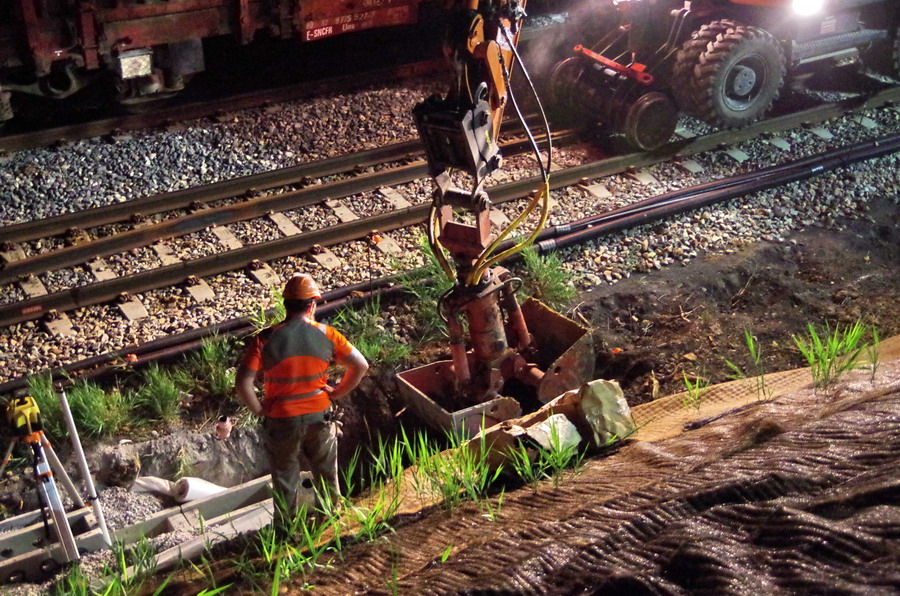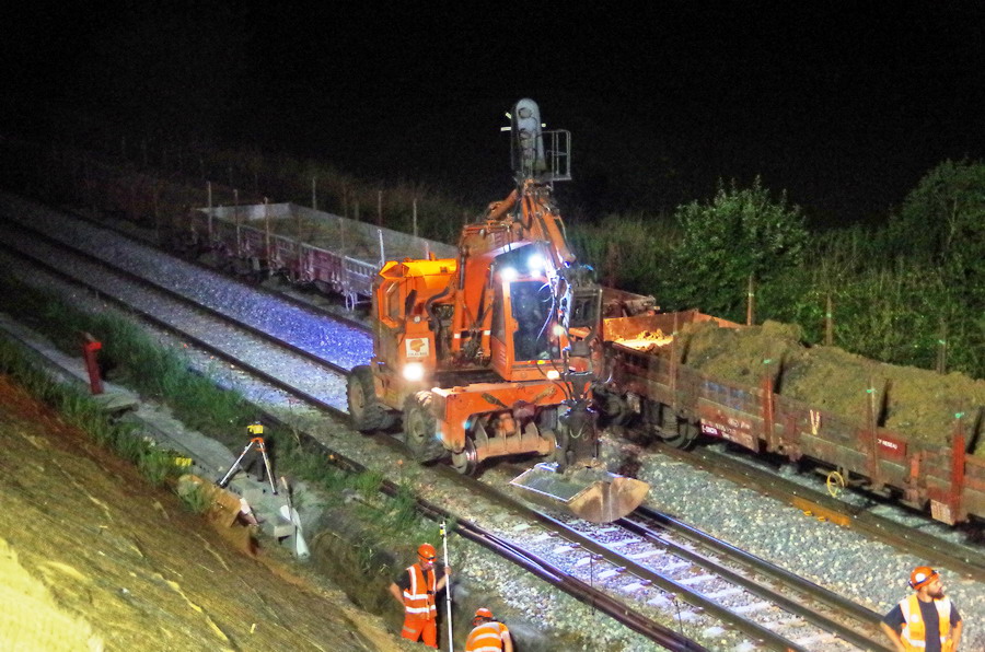 nuit du 26 au 27 juillet 2018 avec le travail pour l'installation des caniveaux par Colas Rail au niveau des ponts de Bray à la bifurcation de Jussy