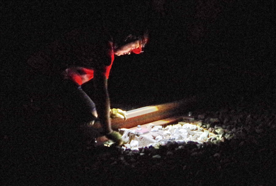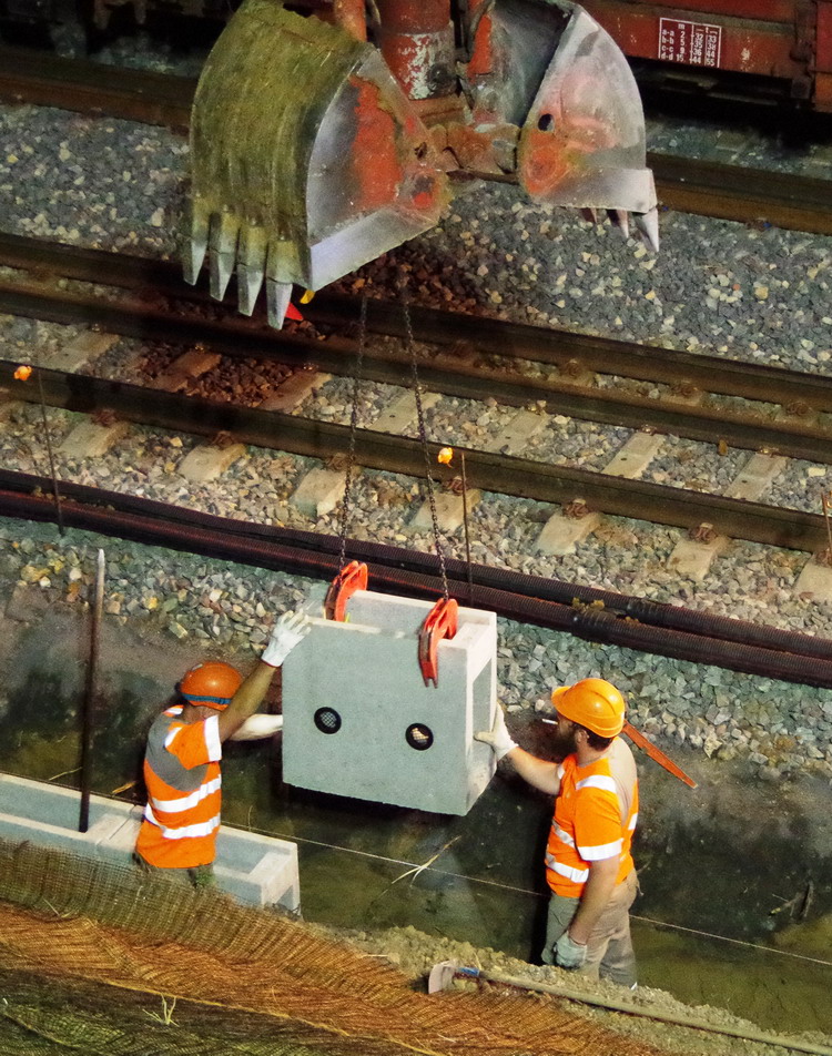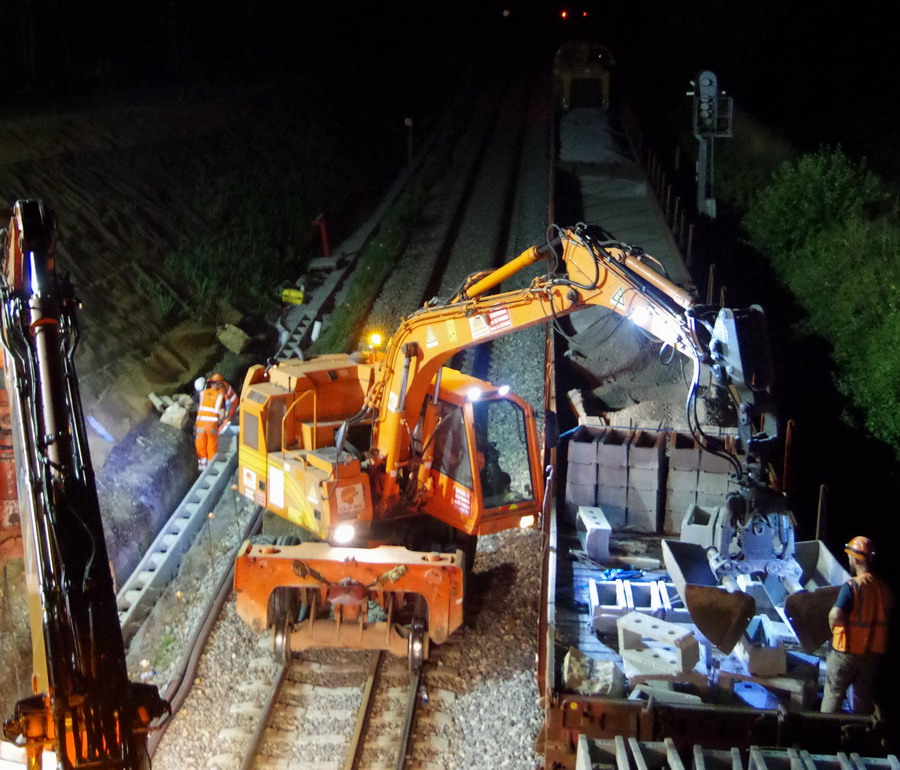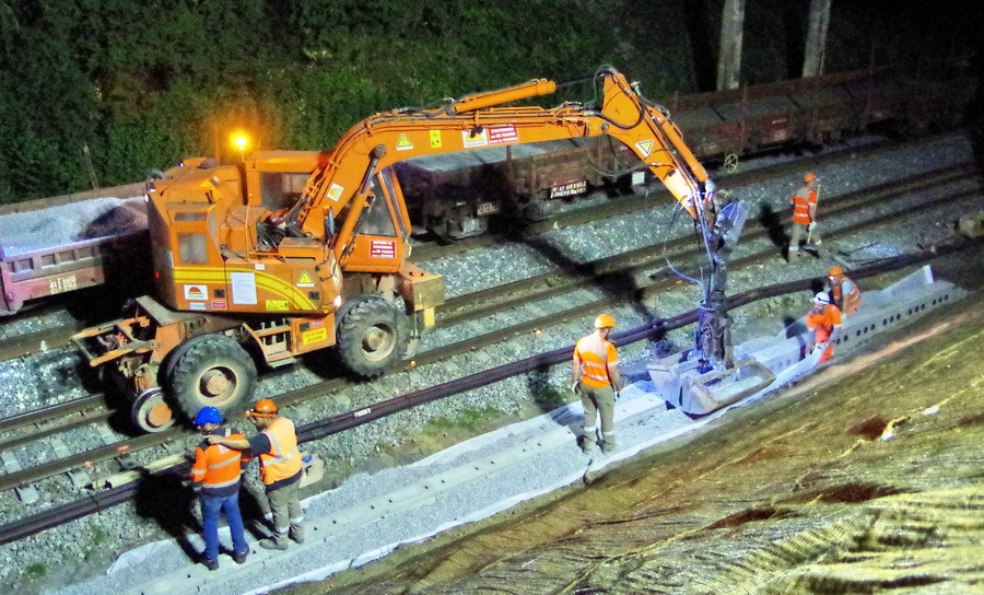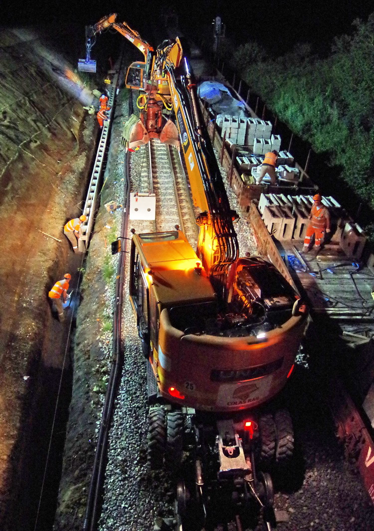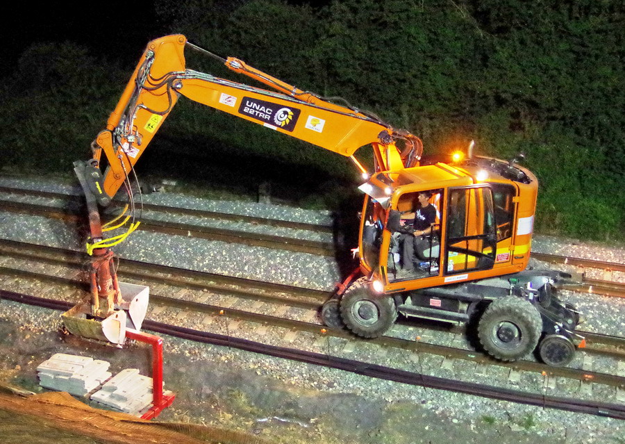 nuit du 26 au 27 juillet 2018 avec le travail pour l'installation des caniveaux par Colas Rail au niveau des ponts de Bray à la bifurcation de Jussy