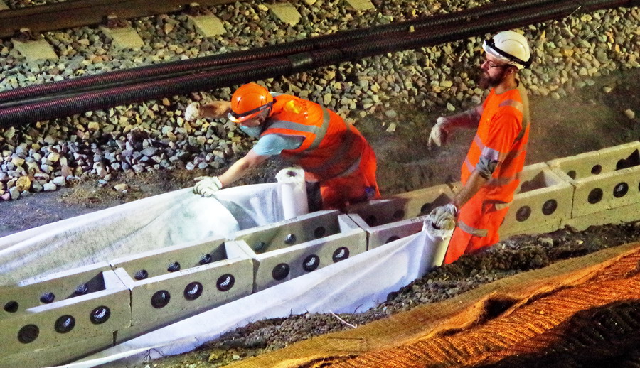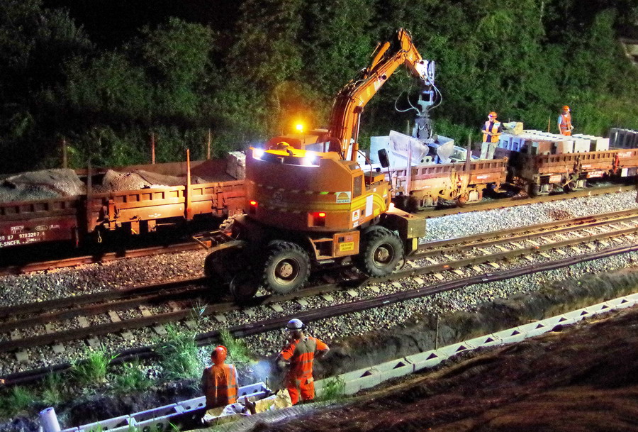 nuit du 26 au 27 juillet 2018 avec le travail pour l'installation des caniveaux par Colas Rail au niveau des ponts de Bray à