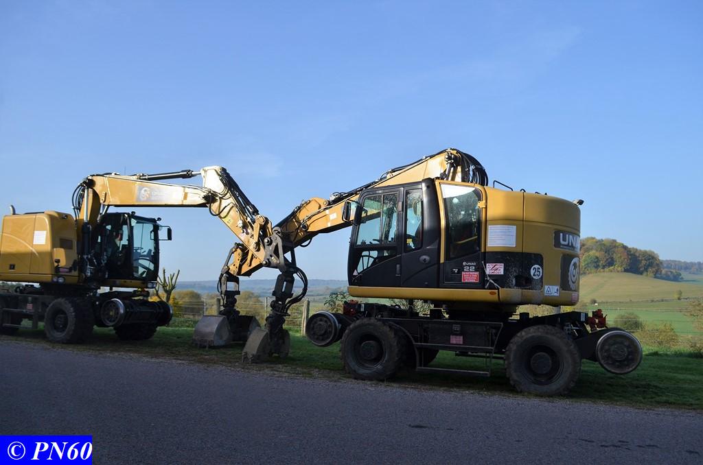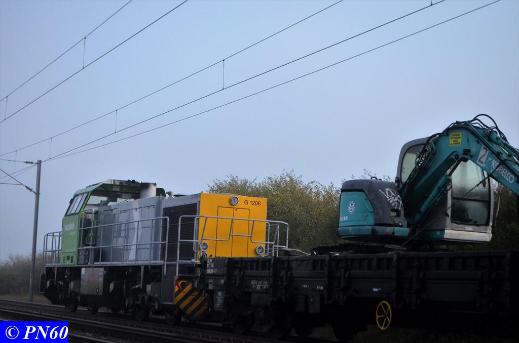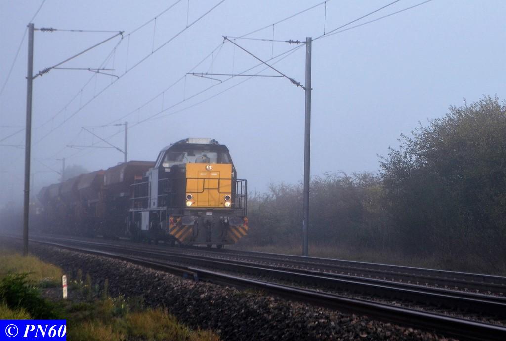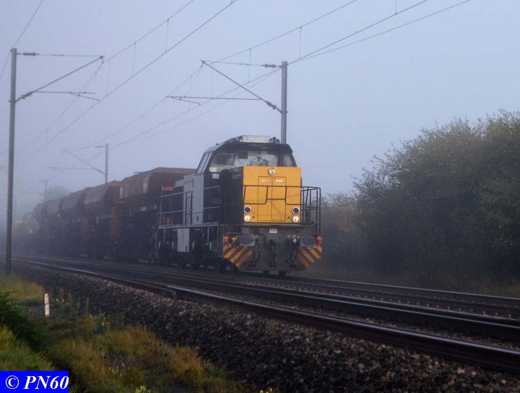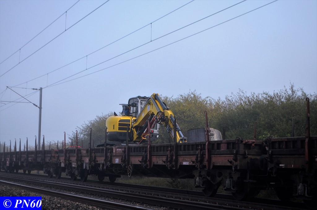 Le 25 septembre 2017 à Levécourt, sortant du brouillard (et oui en ce moment tous les matins le brouillard est présent, gênant ainsi les photographes !!), un train de travaux surement tracté par la G 1206 BB 5001909 n° d'EVN 92 87 0 061 909-3, même machine vu par Eric à Celsoy le 30 octobre 2017.