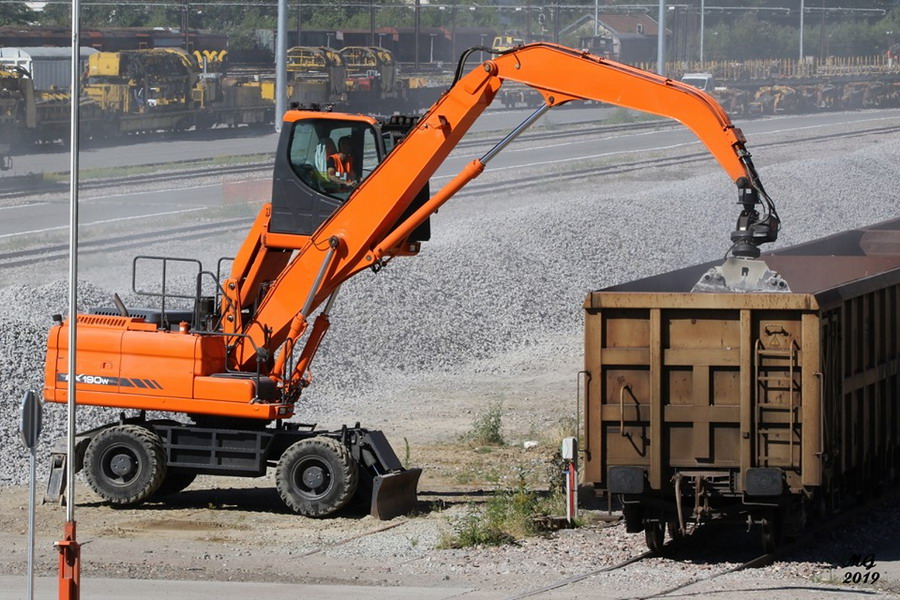 déchargement avec la Pelle route DOOSAN DX190W du ballast sur la base de travaux du Puy-Imbert le 10-07-2019