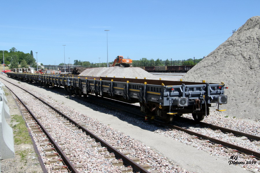 - une rame de wagons plates RES d'ERMEWA sur la nouvelle base arrière de l'ex triage du Puy-Imbert le 14-05-2019
