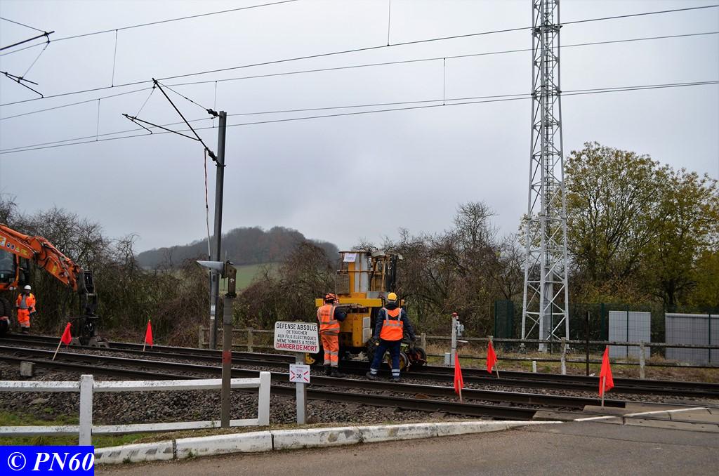 Le 16 novembre 2017, j'ai effectué plusieurs photos du train de dégarnissage COLAS RAIL RM 900-HD 100 AHM, qui fonctionnait entre les PN 59 d'Hacourt et PN 60 de Brainville sur Meuse.