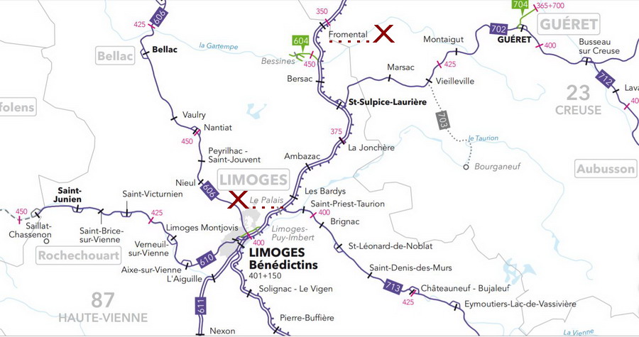 - la carte pour le RVB sur le POLT entre Fromental PK 351,562 et Le Palais-sur-Vienne 392,669