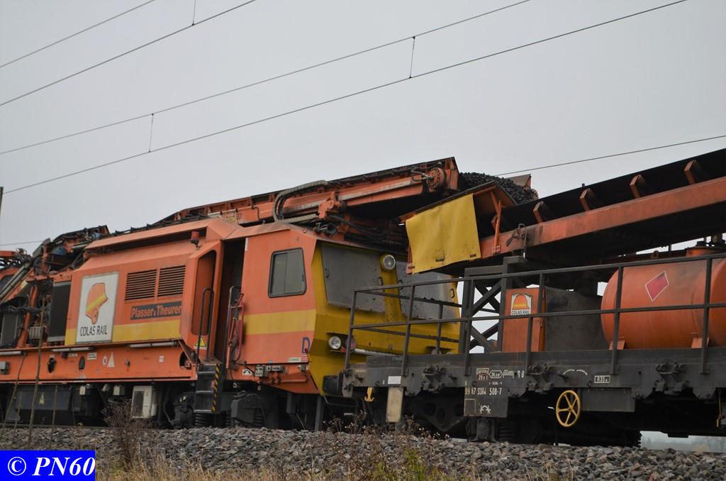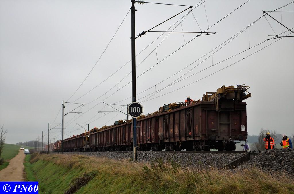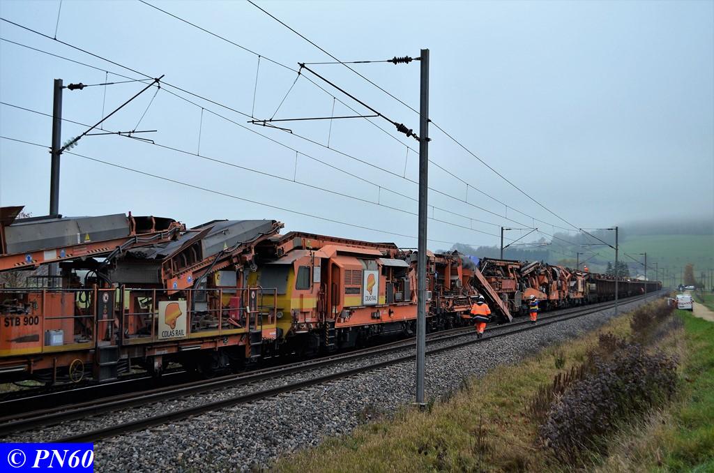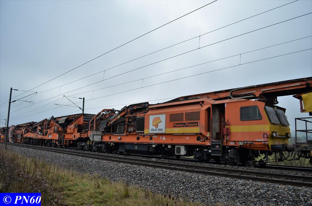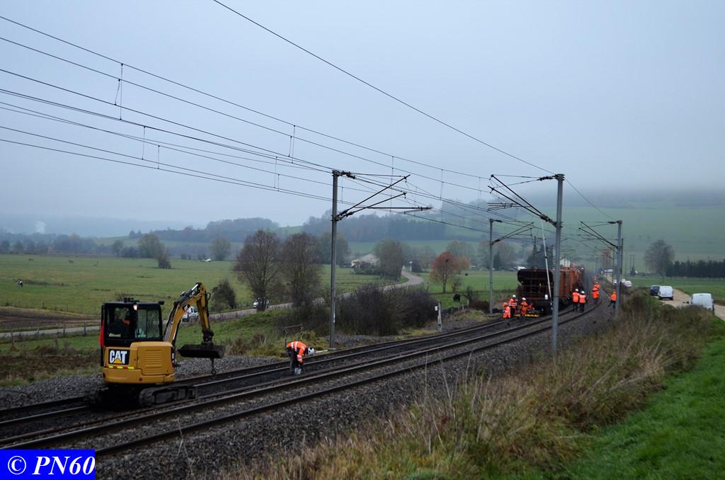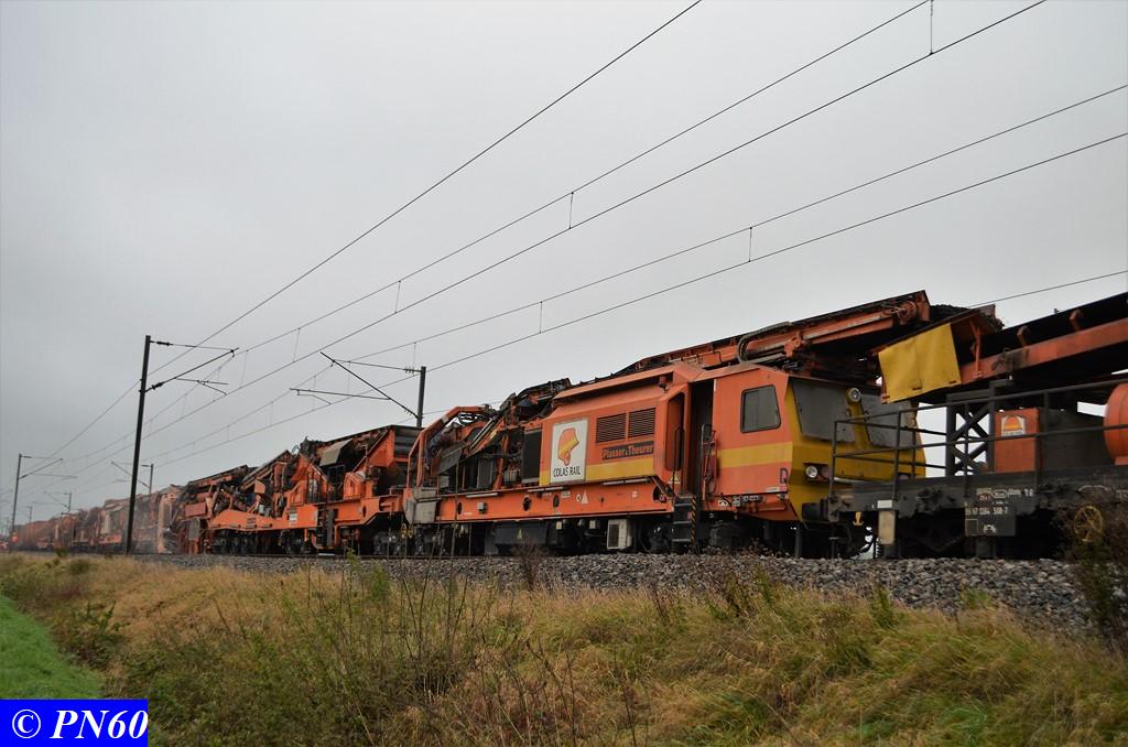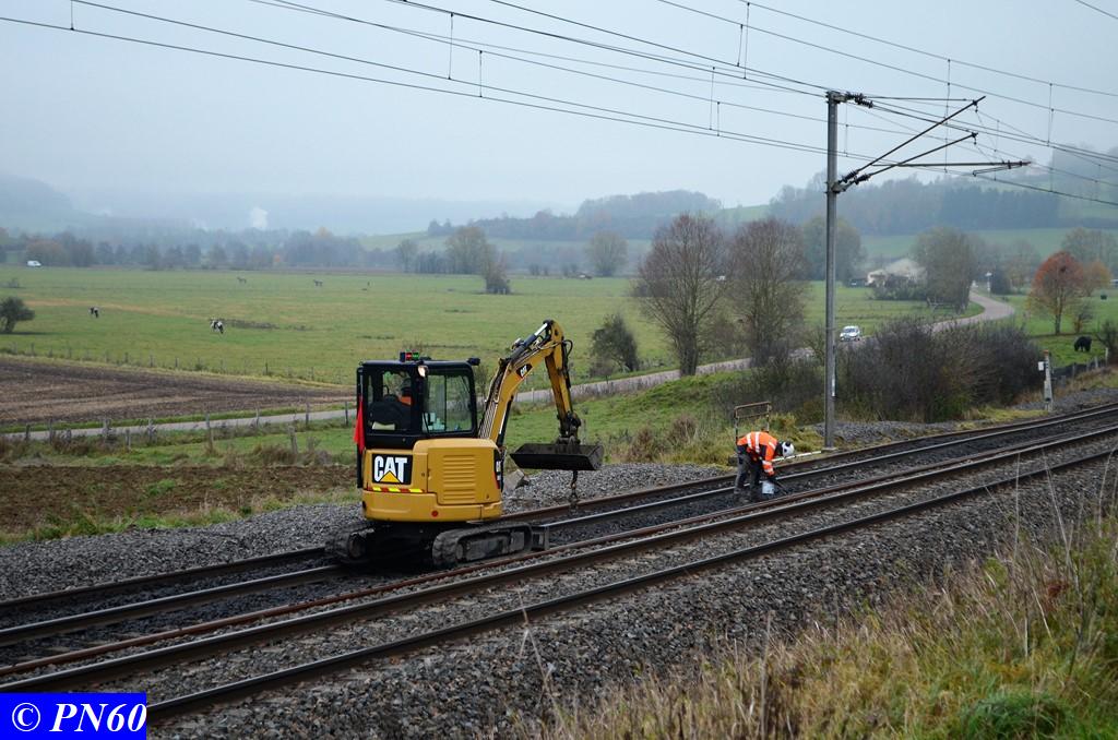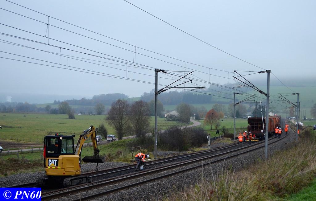 Toujours le 16 novembre 2017, nous remontons la zone de travaux où officie le train de dégarnissage COLAS RAIL RM 900-HD 100 AHM, qui fonctionnait entre les PN 59 d'Hacourt et PN 60 de Brainville sur Meuse.
