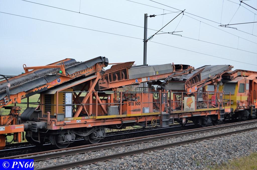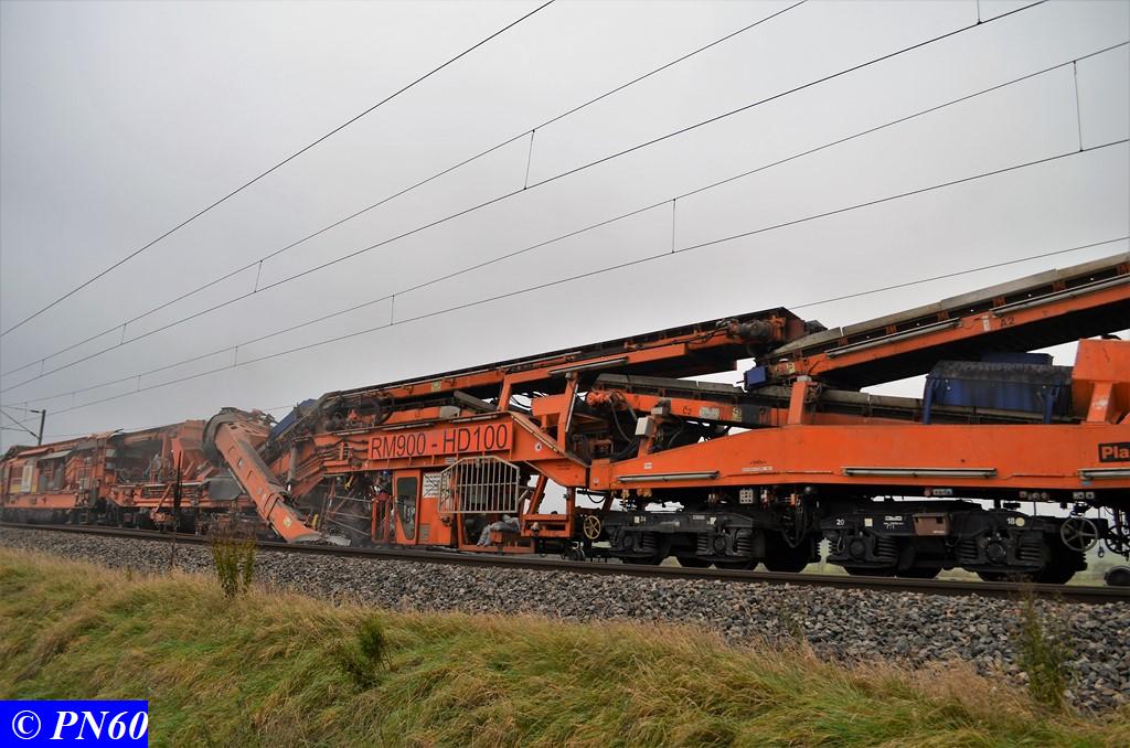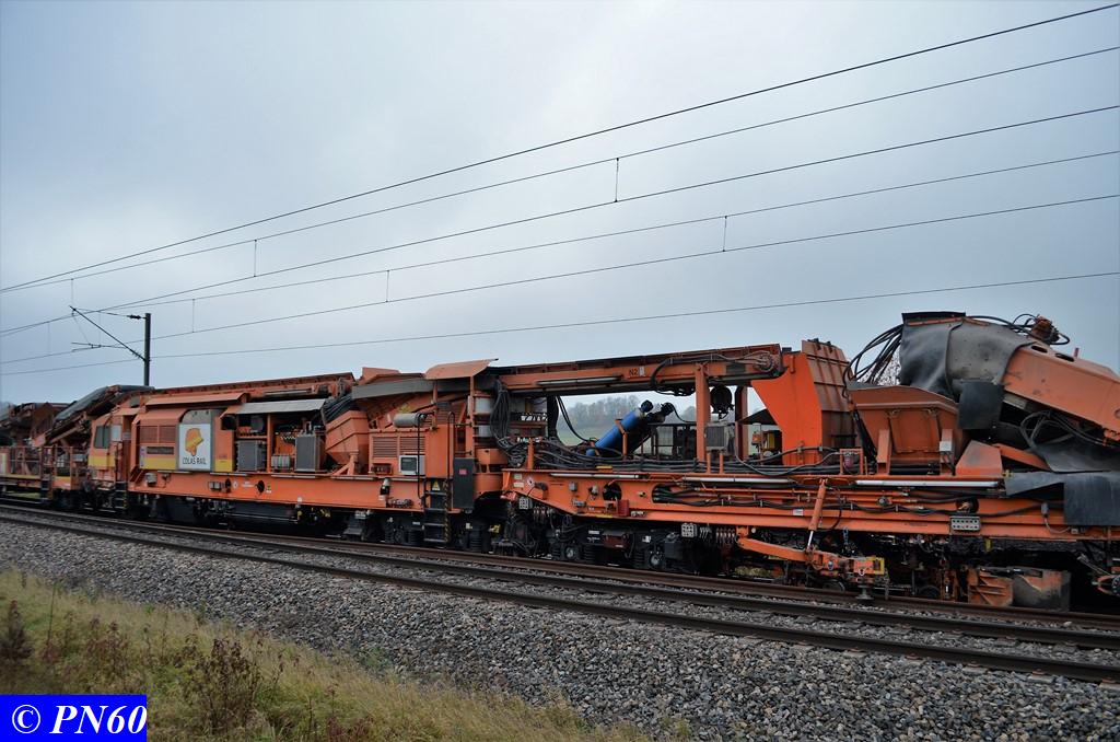 Poursuite des photos de la dégarnisseuse COLAS RAIL RM 900-HD 100 AHM en action à Brainville sur Meuse le 16 novembre 2017.