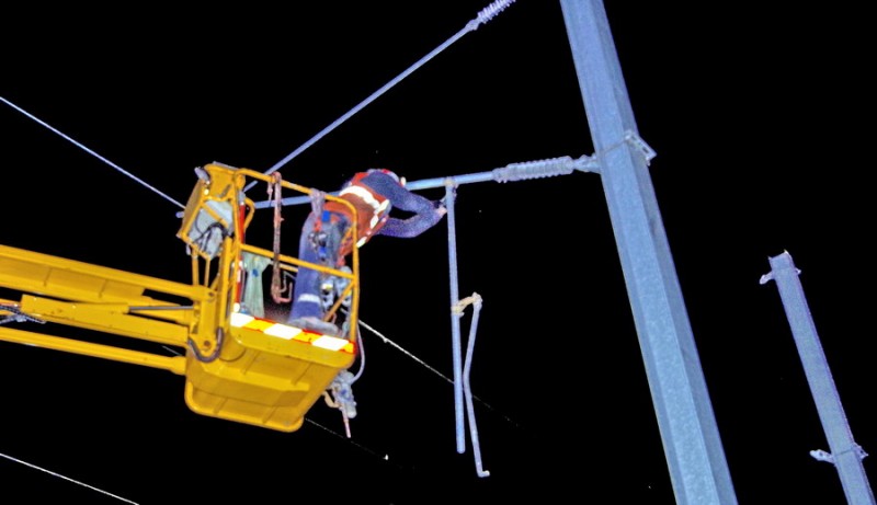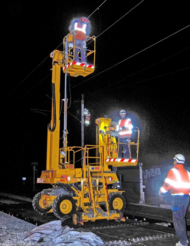 installation de la caténaire sur les consoles des bras articulés par HP Elec au PN 58 à Chauny nuit du 06 au 07-05-2019