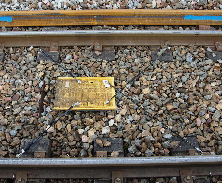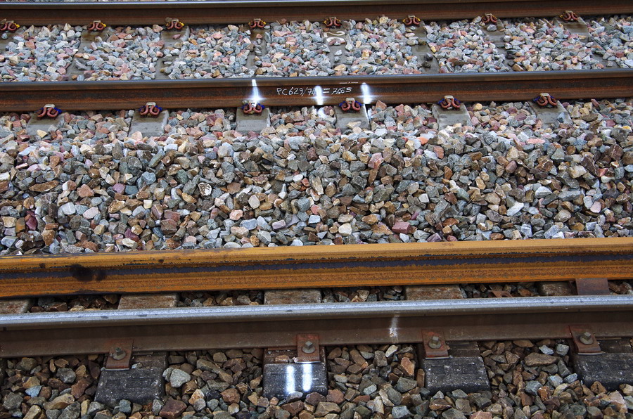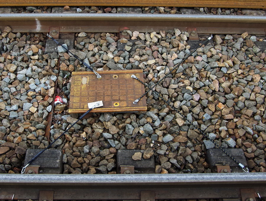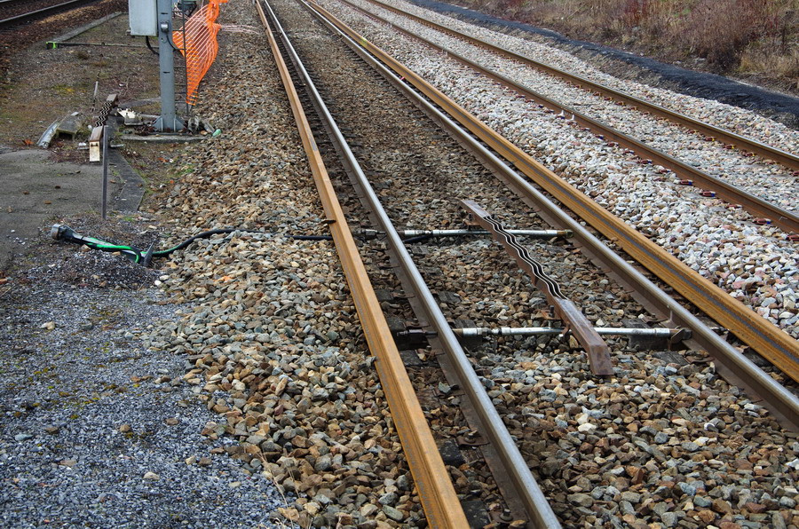 piccelles disposées en ligne droite toutes les 35 traverses, éléments de maintien du rail en attente de la pose définitive des LRS pendant