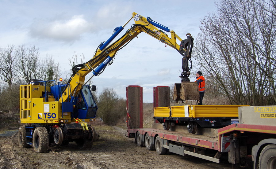 le déchargement se fait avec la Pelle Rail route Geismar KGT Evolution n°5041 de 2014 de TSO / NGE parc n°5 - TSO1745