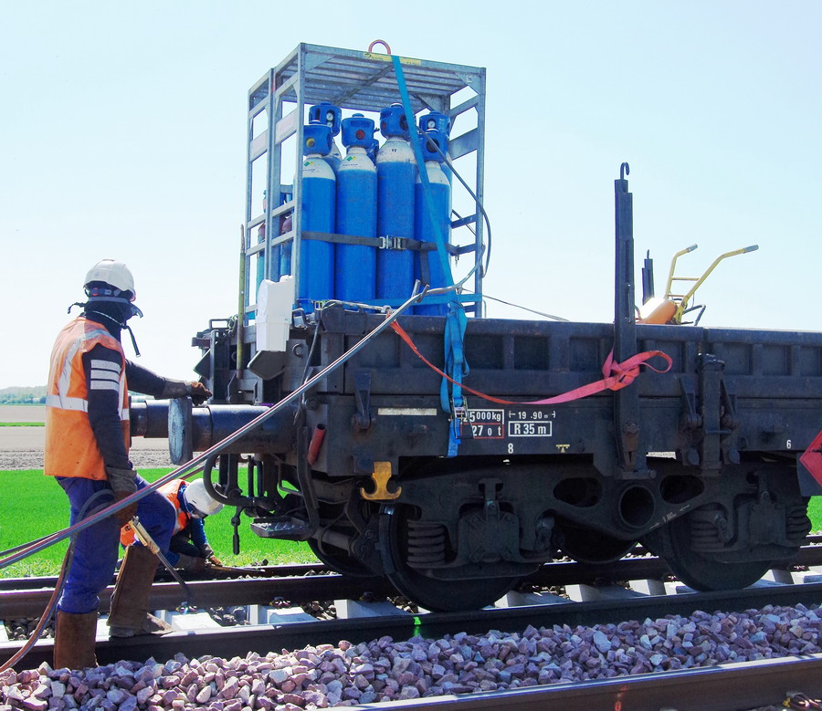 les bouteilles d'oxygene et de propane sont sur le wagon 99 87 9 383 878-5 R80 ETF avec une citerne jaune