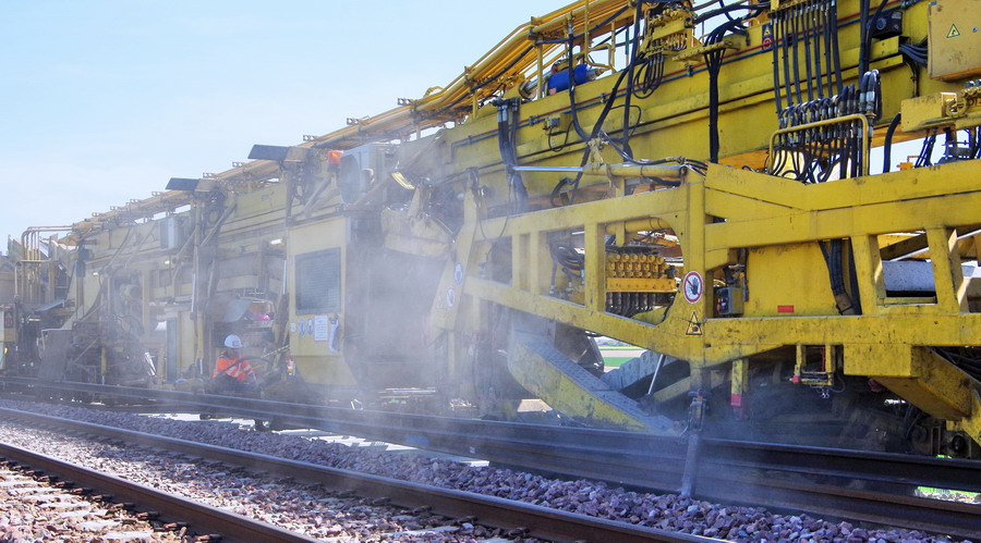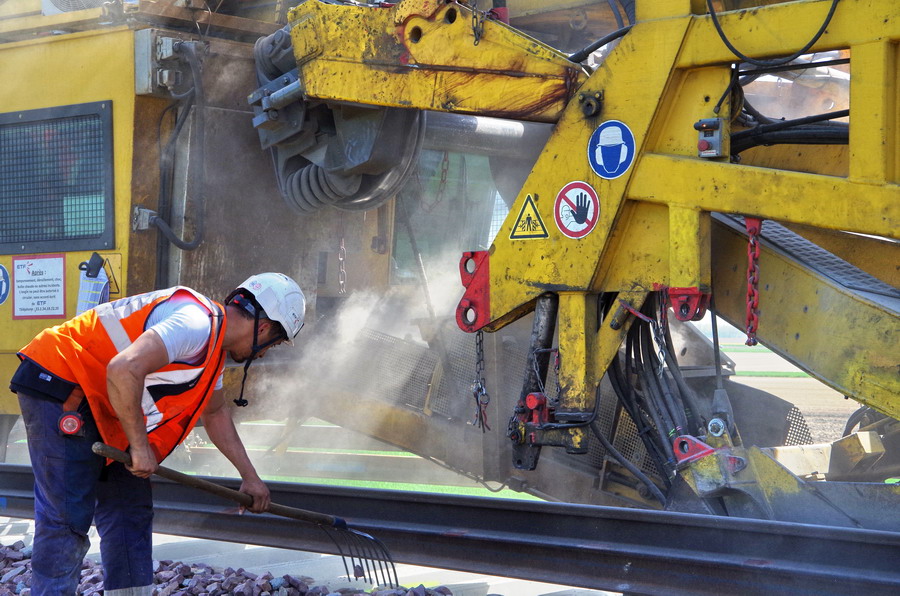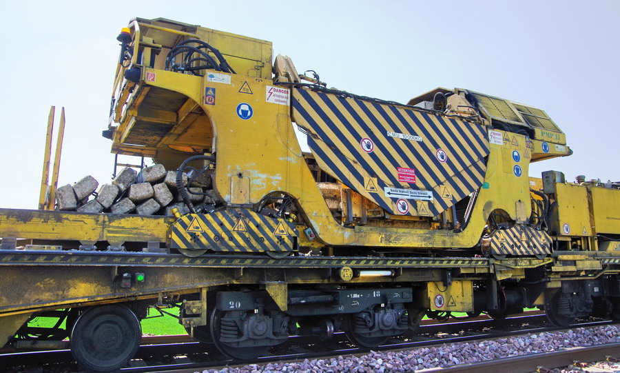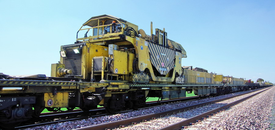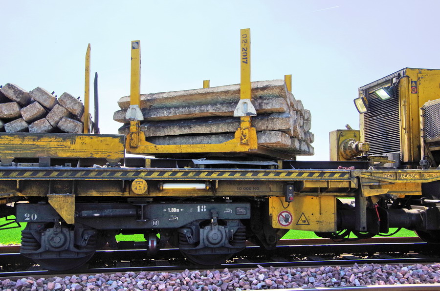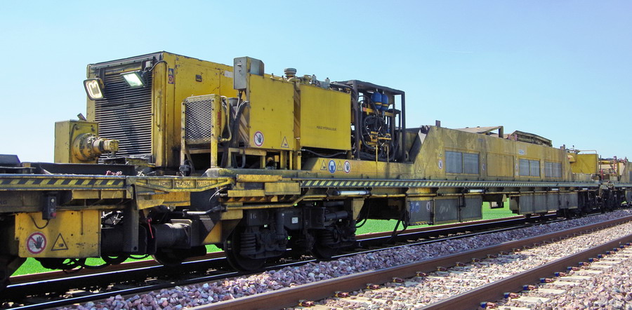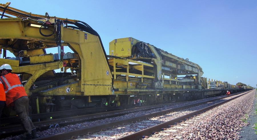 . wagon 5 WF - force avec poutre : évacuation du ballast, enlèvement des anciens rails et pose de nouveaux longs rails soudés