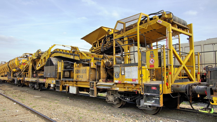 Wagon transfert SDM 800 n°342 - 99 87 9 352 570-5 Meccoli sur la rame de la Dégarnisseuse de retour à Laon le 24-04-2018