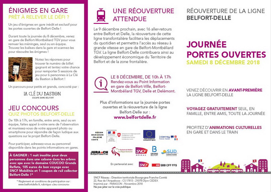 Réouverture au voyageurs de la ligne Belfort-Delle Le 9 décembre prochain, avec 16 allers-retours entre Belfort et Delle, la réouverture de cette ligne transfrontalière facilitera les déplacements du quotidien avec l’accès au réseau à grande vitesse de la LGV Rhin-Rhône et permettra de soutenir le développement économique du Territoire de Belfort et de la zone frontalière.