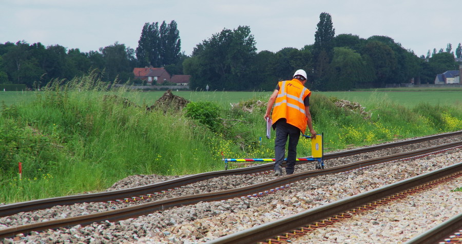 prise de mesure laser avec un chariot monorail Geismar au PK 32 du PN n°14 de Rosières-en-Santerre (80) le 30-05-2018