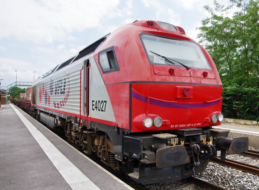 puis passage du train n°T1T2 avec la E 4027 - 92 87 0 004 027-4 F-VFLI en location sur une rame de wagons plats