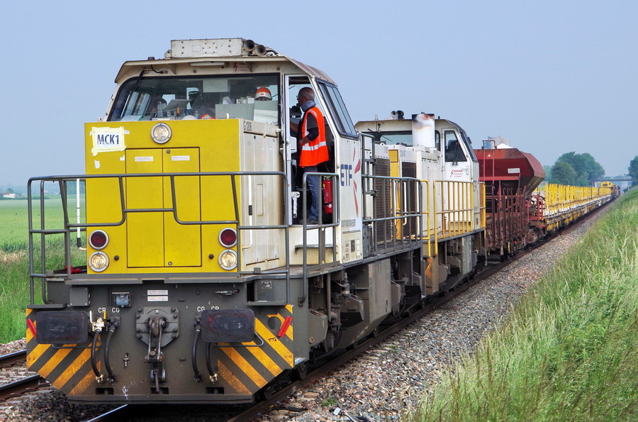 Train de pose P95 ETF 99 87 9 311 503-6 - ETF - "Addax avec le wagon 1 WEK - de tirefonnage transportant les 2 PMP (Portique de manutention des palettes de traverses) PK 20 à Marcelcave le 04-06-2018