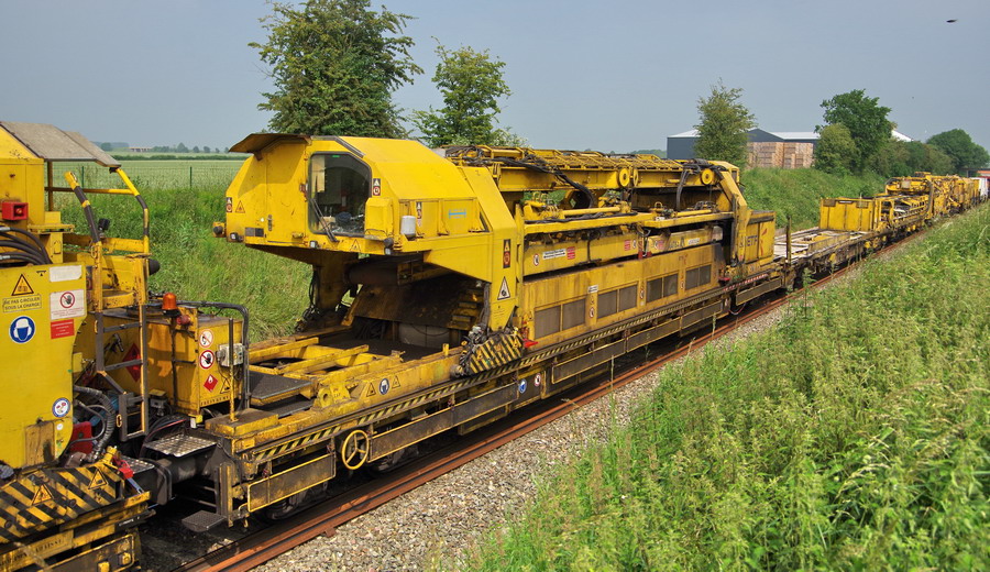 . wagon 5 WF - force avec poutre : évacuation du ballast, enlèvement des anciens rails et pose de nouveaux longs rails soudés