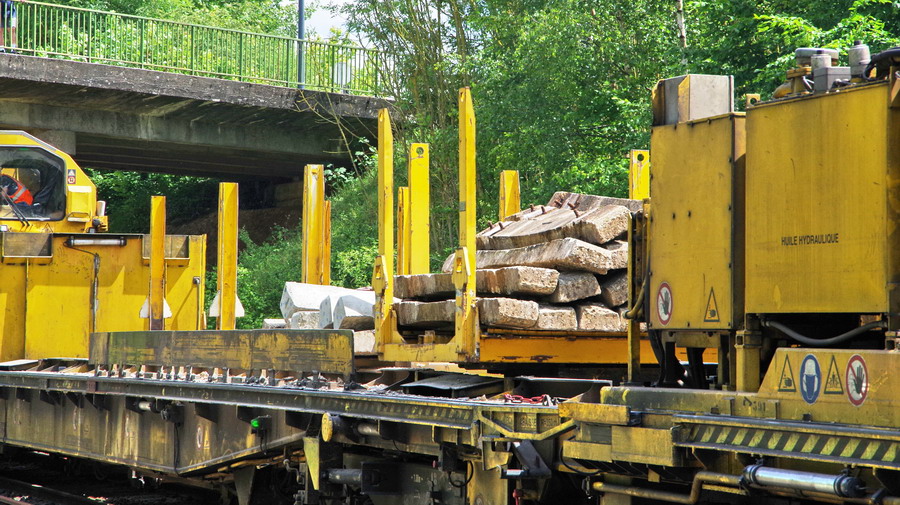 le wagon 80 87 976 7 101-9 Ua R00 5 F SNCF-PSL ramassage et distribution d'agrès avec un des 2 PMP (Portique de manutention des palettes de traverses)