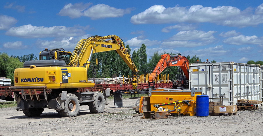 les Pelles route Komat'su PW200 (2&) et DOOSAN sur le site de travaux de la gare de Laon le 22-06-2018