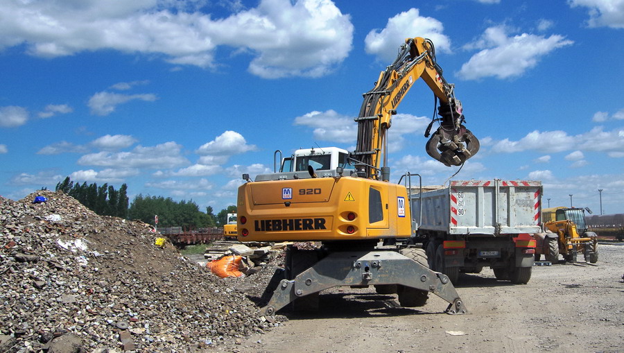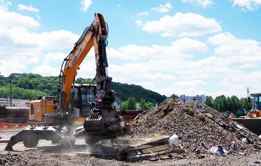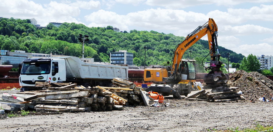 chargement des tombereaux avec les déchet de terre du RVB pour le recyclage et la valorisation des déchets sur le site de travaux de la gare de Laon le 22-06-2018