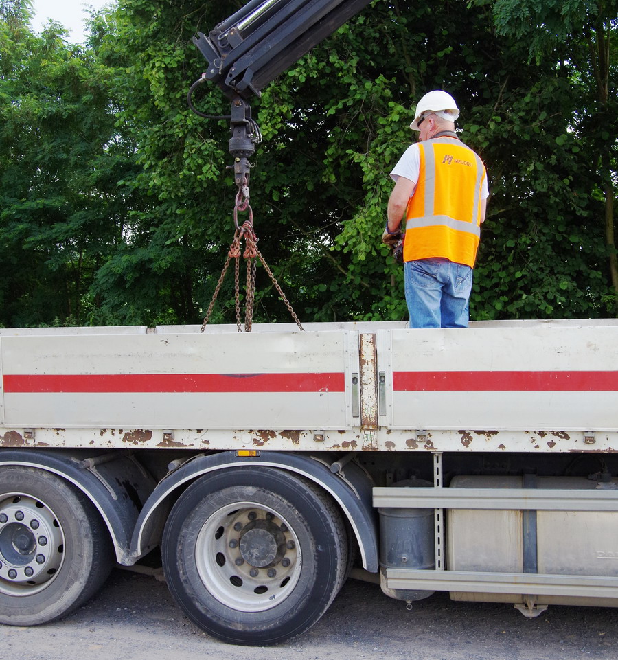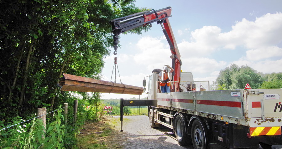 pour le déchargement d'un camion DAF 85-460 CF - CD-412-QY (37) de Meccoli de coupons de rails de 6m de long en provenance et stockés