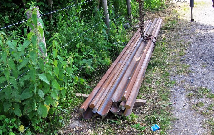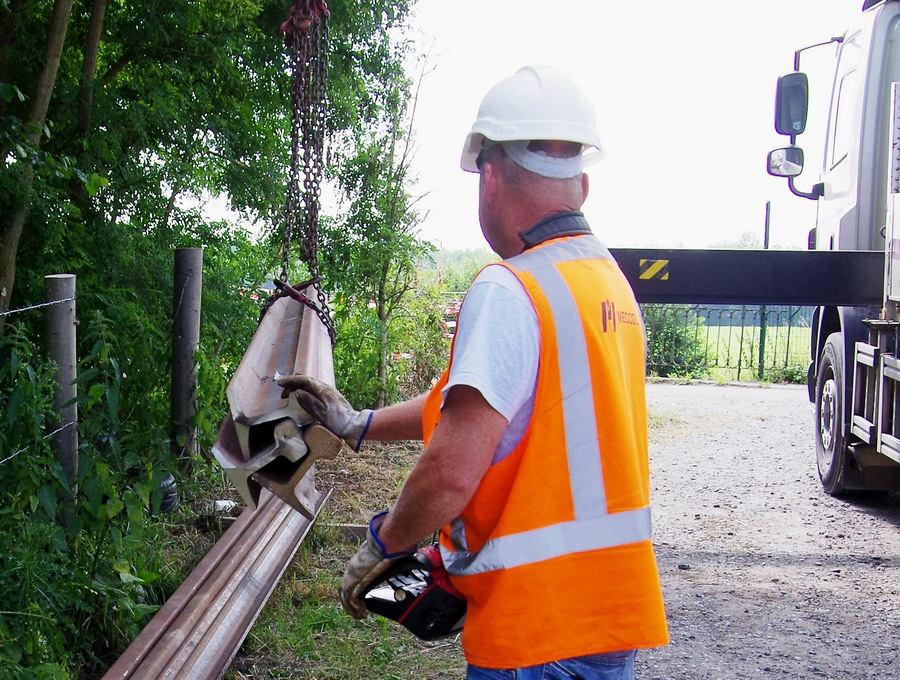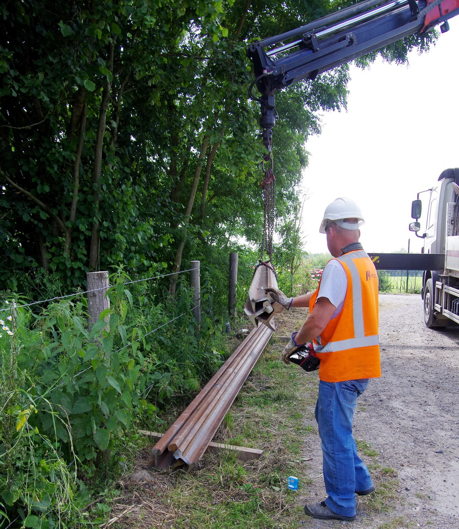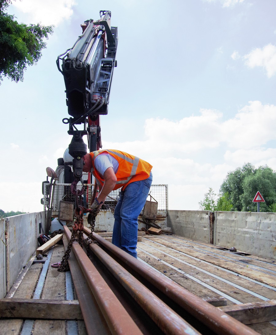 déchargement d'un camion DAF 85-460 CF Meccolli de coupons de rails au pont de Bray à Jussy (02) le 25-06-2018
