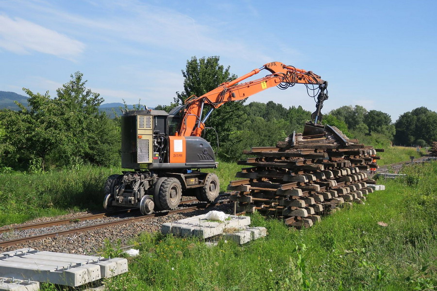 positionnement des tronçons de rails avec la Pelle Rail route Hitachi D2R ZX 170 PRR série C182 Dambach-la-Ville le 28-06-2018