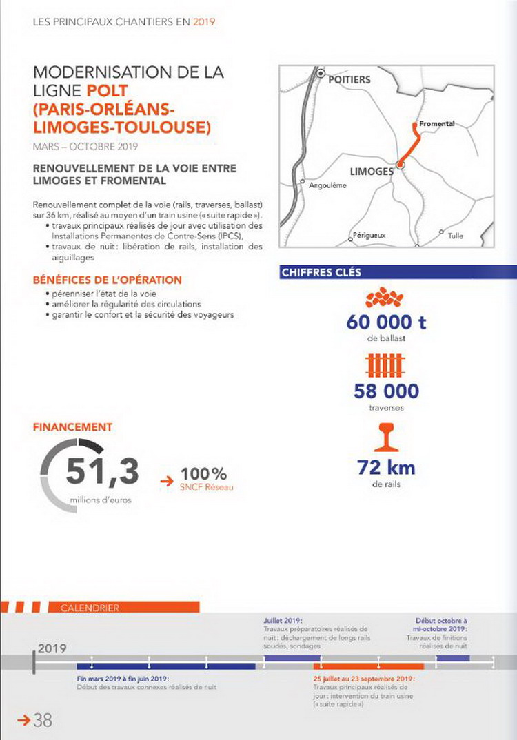 Travaux de RVB sur la ligne POLT entre Limoges PK 401,190 et Fromental PK 351,562 en direction d'Orléans entre mars et octobre 2019