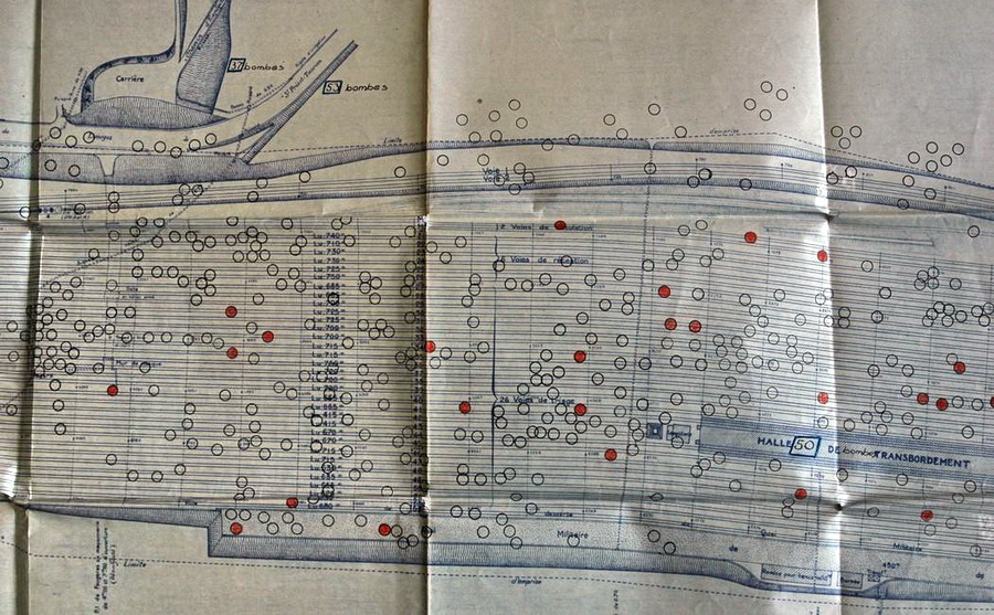 Le plan de la gare de Puy-Imbert, réalisé quelques jours après le raid, montrant les impacts de bombes (cercles noirs) et les bombes non explosées (cercles rouges), Ce plan est conservé actuellement aux archives départementales de la Haute-Vienne.