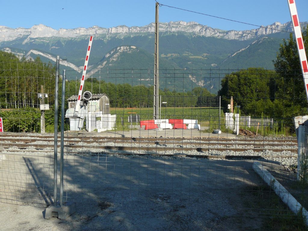 Les panneaux avertissant de la circulation de trains pendant la fermeture de la ligne sont placés aux abords des PN de la ligne comme sur cette photo près de Tencin.