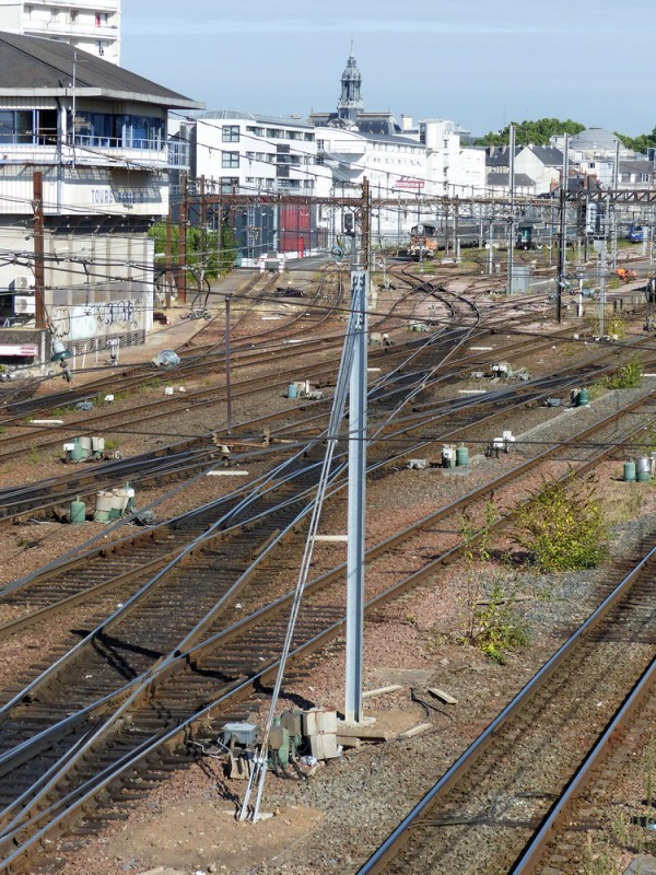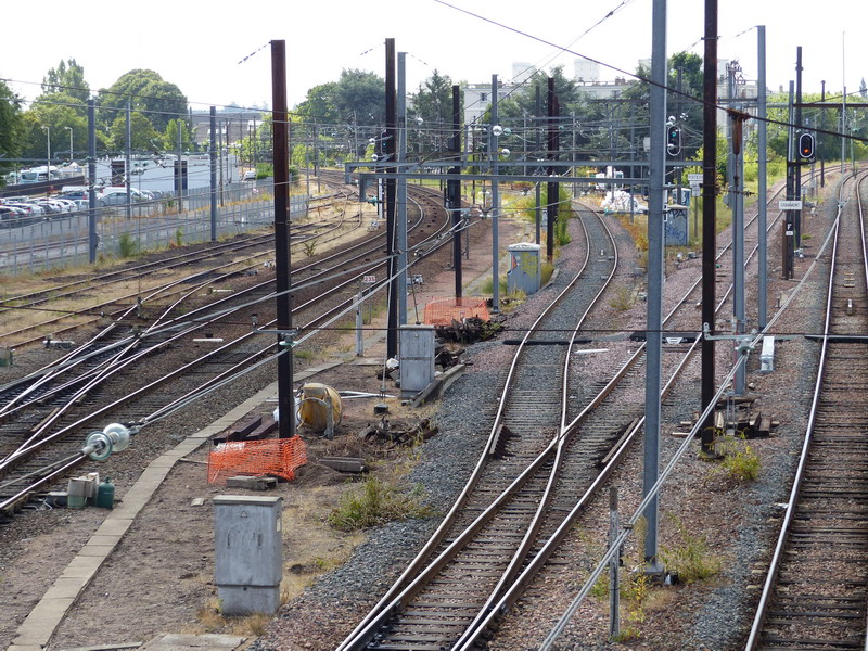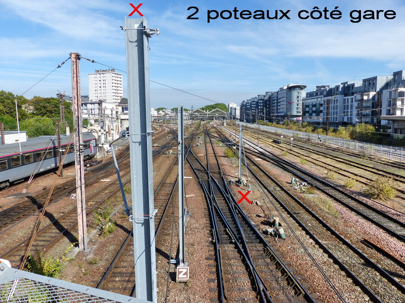voici l'autre côté de la passerelle avec deux portiques de caténaires entre les voies pour Nantes