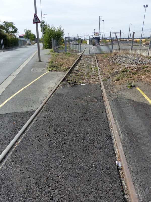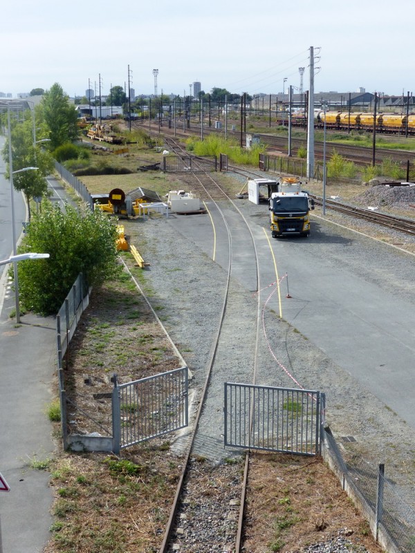 avec la voie qui rejoint la RFN (Réseau Ferré Français) avec des marquages jaunes au sol pour le gabarit de sécurité