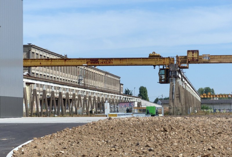 vue sur l'entrée de l'atelier IMATEQ avec au fond l'ancien pont transbordeur et le nouveau
