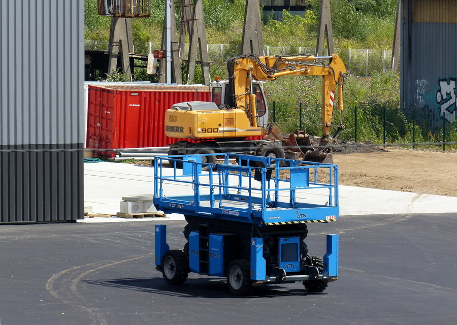 au sol du parking de l'atelier et quelques engins, Nacelle élévatrice et Pelle route une LIEBHERR 900