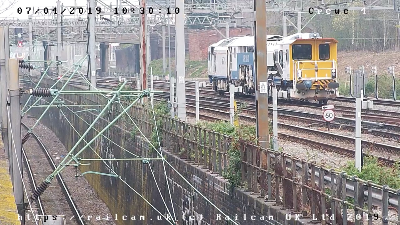 Machine de finissage de ballast "ballast finishing machine", DR77002 . Swietelski Babcock Rail, entre-aperçue sur la webcam de CREWE en Angleterre du Nord Ouest sur la WCML (West Coast Main Line) ce dimanche matin.
