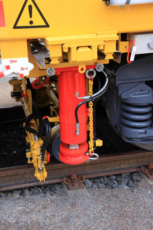 La conception « Split-Head » des groupes de bourrage convient particulièrement pour les travaux de bourrage sur les voies dotées d’un rail de guidage : Pour une file de rails, le groupe est séparé dans la longueur, constituant ainsi deux châssis mobiles translatables latéralement. Grâce à cet équipement, l’intervalle entre les rangées de bourroirs peut être réglé avec précision selon la configuration de la voie.