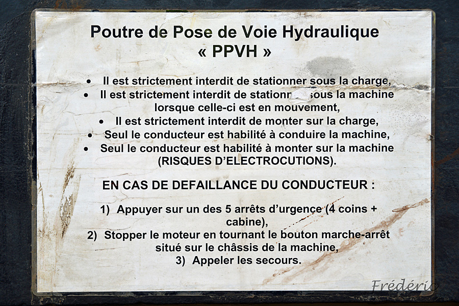 J'adore la mention :EN CAS DE DEFFAILLANCE DU CONDUCTEUR Et encore plus la conduite a tenir :Appuyer sur un des 5 arrêts d'urgence ( 4 coins + cabine )Alors que sur les lignes du dessus il est écrit :Seul le conducteur est habilité a monter sur la machinePourquoi signaler l'arrêt d'urgence de la cabine dans ce cas