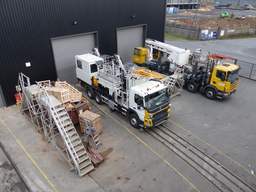 Véhicule de type rail-route, équipé d'une nacelle élévatrice ascendante et descendante pour le personnel est destiné à l'inspection des ouvrages d'arts sur voie ferrée et sur route.