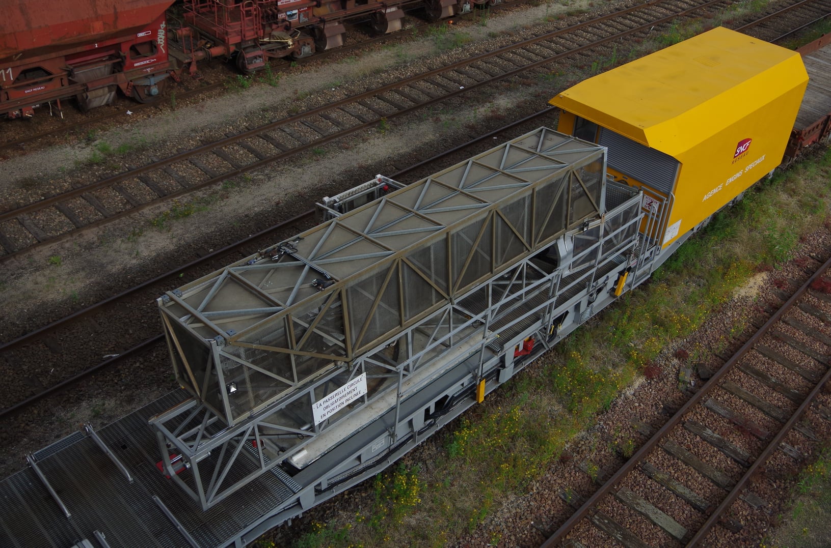 wagon d'inspection des ouvrages d'art de 'l'Agence Engins Spéciaux' avec sa voiture de cantonnement