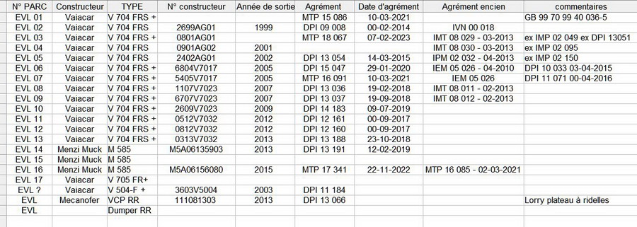 Voici un début de synthèse du Parc d'EVL si vous avez d'autres infos dites le moi (n°, dates, Agréments...)