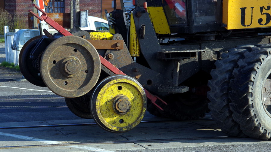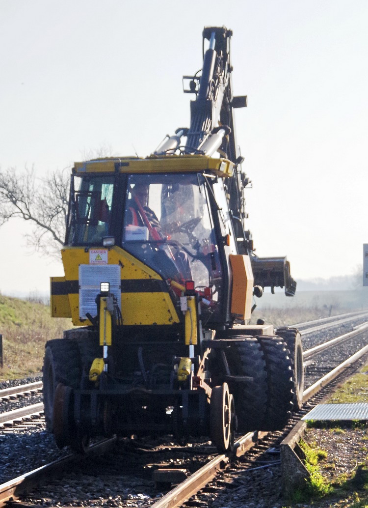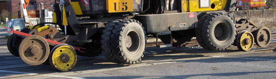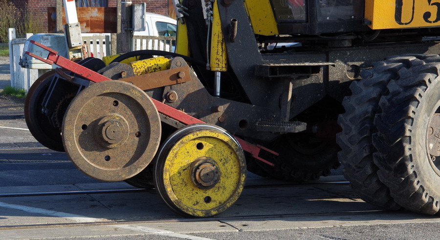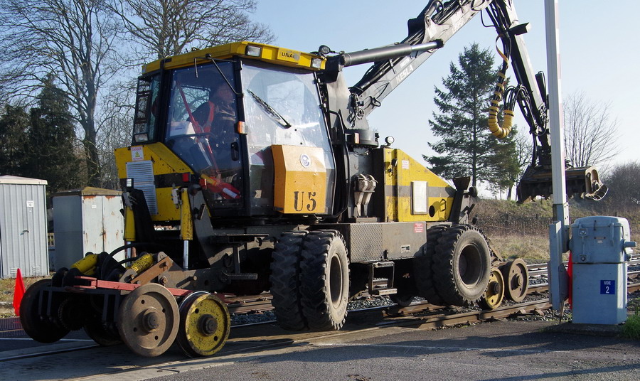 la débroussailleuse rail-route va se mettre sur les rails elle profite du passage a niveau pour se mettre sur les rail puis elle part sur la zone de chantier