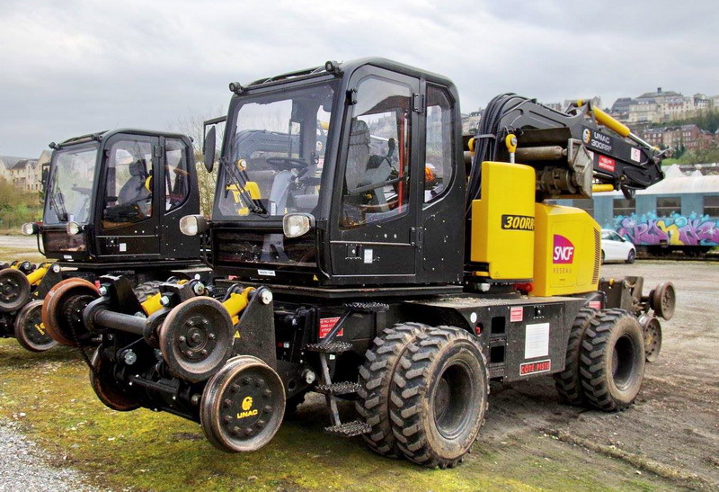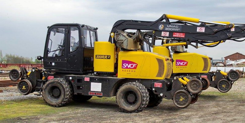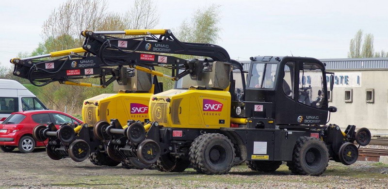 il se trouve sur la base de travaux de la gare de Laon (02) avec un autre UNAC 300 RR2 n°BCDFXX-025 SNCF RESEAU n°21