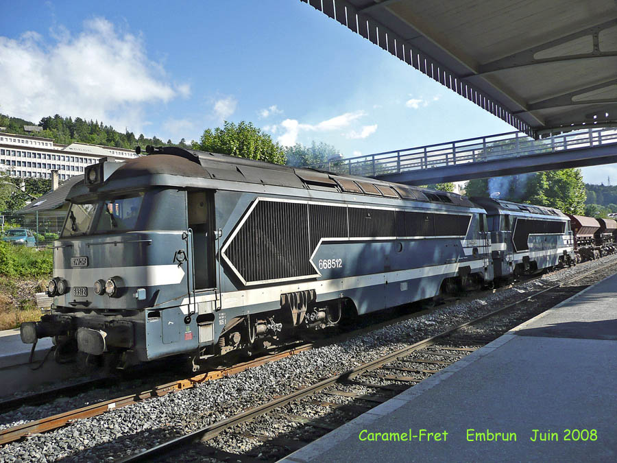 Juin 2008, Gare d'Embrun: l'UM A1A 68512 et A1A 68520 enlève un train de ballast en direction de Gap.